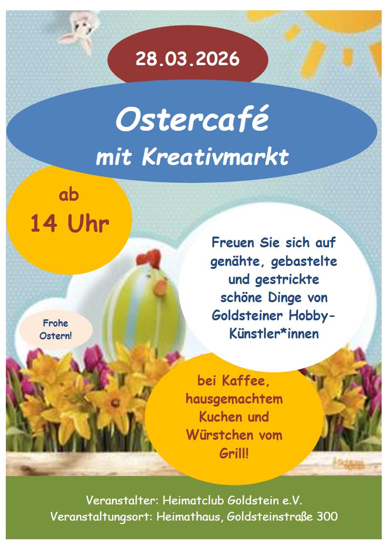 Am Samstag, 28. März 2026, findet im Heimathaus Goldstein ab 14 Uhr wieder das beliebte Ostercafé mit Kreativmarkt statt.